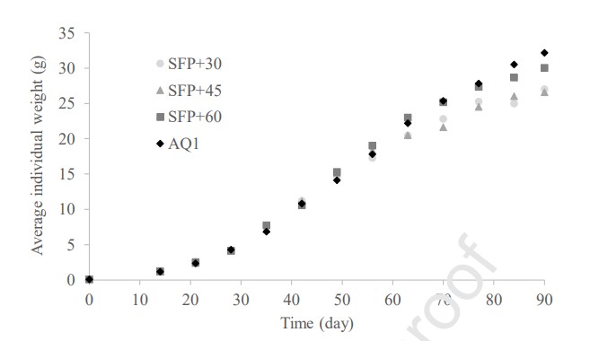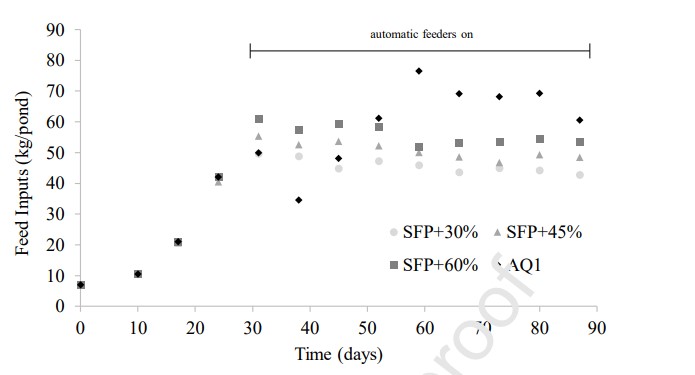 Trong 30 ngày đầu tiên, chương trình cho ăn cho tất cả các nghiệm thức đã được lập trình trước sau SFP được mô tả trước đó, giả định các ước tính cho mật độ cũng như tăng trưởng. Mặc dù đây không phải là một giao thức tối ưu hóa nhưng người ta cho rằng năng suất chính là một phần đáng kể lượng chất dinh dưỡng và đầu vào thức ăn phải được tăng lên một cách có hệ thống để cho phép điều hòa ao với tải lượng thức ăn cao. Ngoài ra, vì thức ăn cho tôm thấp hơn trong các ao chuỗi thức ăn, năng suất chính có nhiều khả năng là một trong những nguồn dinh dưỡng chính ở giai đoạn này và thức ăn thừa cũng sẽ kích hoạt sự phát triển của thực vật phù du (NRC, 2011). Sau 30 ngày nuôi cấy, các nghiệm thức đã được bắt đầu và thức ăn được phân tán bằng cách sử dụng bộ nạp hẹn giờ. Vào ngày 34, hệ thống AQ1 đã được bắt đầu. Tổng lượng thức ăn đầu vào (kg/ha) khác nhau đáng kể cho mỗi lần xử lý (Bảng 2). Bằng cách đánh giá đầu vào thức ăn thông qua chu kỳ sản xuất (Hình 2) và so sánh điều này với mức tăng trưởng trung bình của từng cá nhân (Hình 3), có thể nhận ra một số khác biệt về thức ăn. Từ ngày 38 đến ngày 45, đầu vào thức ăn cho hệ thống cho ăn AQ1 đã giảm đáng kể. Có hai cách giải thích có thể xảy ra về điều này: kích thước nhỏ của tôm tạo ra tín hiệu âm thanh tối thiểu dẫn đến đầu vào thức ăn thấp hoặc năng suất sơ cấp vẫn là nguồn thức ăn đủ cho tôm trong loại kích thước đó. Vì không có sự khác biệt về trọng lượng trung bình, có vẻ như đầu vào thức ăn giảm không ảnh hưởng đến tăng trưởng. Từ thời điểm này, đầu vào nguồn cấp dữ liệu AQ1 tăng đều đặn cho đến ngày thứ 59, nơi nó đạt đỉnh. Từ 50 ngày đến khi kết thúc sản xuất, đầu vào thức ăn chăn nuôi cao nhất cho các nghiệm thức AQ1. Dựa trên trọng lượng mẫu, rõ ràng là có tới 45 ngày nuôi, mức đầu vào thức ăn thấp nhất là chấp nhận được. Tuy nhiên, sau thời điểm này nghiệm thức SFP + 30% và SFP + 45% xử lý thức ăn dẫn đến tôm nhỏ hơn hoặc tốc độ tăng trưởng giảm. Tôm được nuôi bằng mức SFP + 60% duy trì mức tăng trưởng tương tự như hệ thống AQ1 cho đến ngày 73, sau đó có vẻ như tăng trưởng đã giảm. Dữ liệu này khiến chúng tôi tin rằng có thể đạt được tốc độ tăng trưởng cao với đầu vào thức ăn thấp hơn AQ1 mặc dù đến một lúc nào đó thức ăn sẽ trở thành một yếu tố hạn chế cho sự tăng trưởng. Bất kể không có sự khác biệt nào về FCR giữa các nghiệm thức đã được đăng ký và các giá trị được báo cáo là nhiều hơn mức chấp nhận được trong tất cả các nghiệm thức.