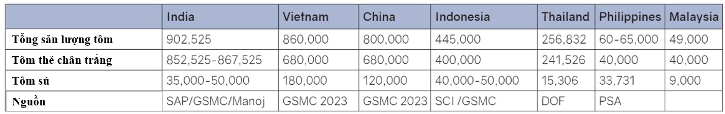 Bảng 1. Một số ước tính về sản lượng tôm nuôi (tấn) ở các nước lớn ở Châu Á. DOF- Cục Thủy sản, Thái Lan; SAP- Hiệp hội các chuyên gia nuôi trồng thủy sản, Ấn Độ; GSMC 2023-Hội nghị tiếp thị thủy sản toàn cầu, 15-19 tháng 1 năm 2023, Palm Springs, California, Hoa Kỳ; SCI- Câu lạc bộ tôm Indonesia; Manoj Sharma, Mayank Aquaculture, Ấn Độ; Cơ quan thống kê Philippines.