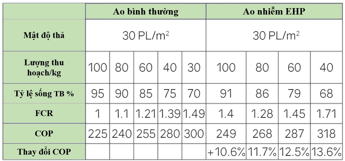 Bảng 2. So sánh tỷ lệ sống, tỷ lệ chuyển đổi thức ăn (FCR) và chi phí sản xuất (COP) trong ao có độ mặn thấp (5-12ppt), có và không có Enterocytozoon hepatopenaei (EHP) ở Andhra Pradesh, Ấn Độ. Cuộc khảo sát được thực hiện trên gần 1.000 ao từ tháng 6 năm 2022 đến tháng 2 năm 2023. Nguồn: B. Ravikumar và Gnanasri Jandhyala, Growel Feeds Pvt Ltd. Quy đổi: 82,52 INR=1 USD (20/3/2023).