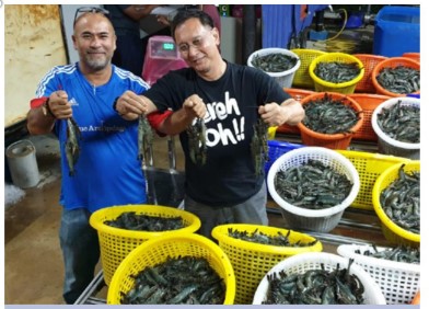 Wan Nadhri Wan Fauzi (bên phải) với vụ thu hoạch tôm sú tại Blue Archipelago Bhd.