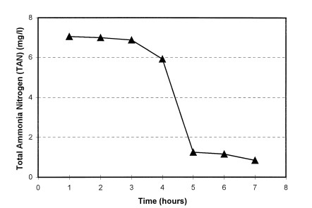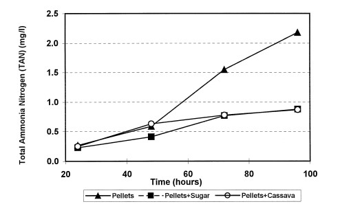 Việc bổ sung carbohydrate để kiểm soát nồng độ nitơ trong ao nuôi tôm đã được thử nghiệm trong các bể chứa sinh khối tôm dày (0,8 kg/m2). Đường (glucose) và bột sắn được thêm vào để giảm tích tụ TAN. Việc bổ sung chất nền chứa cacbon được tính toán với giả định lượng bài tiết amoni tương đương với 33% lượng thức ăn (một đánh giá thấp đáng kể về lượng bài tiết amoni). Việc bổ sung chất nền cacbon đã làm giảm đáng kể sự tích tụ amoni trong bể (Hình 2). Nitrat và nitrit cũng giảm từ 1,97 mg (NO3 + NO2) – N/l ở nghiệm thức đối chứng xuống còn 1,13 mg (NO3 + NO2) – N/l ở bể xử lý.