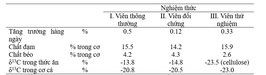 Các đồng vị protein, chất béo và carbon ổn định được xác định trong mô cá vào cuối thời gian thí nghiệm.