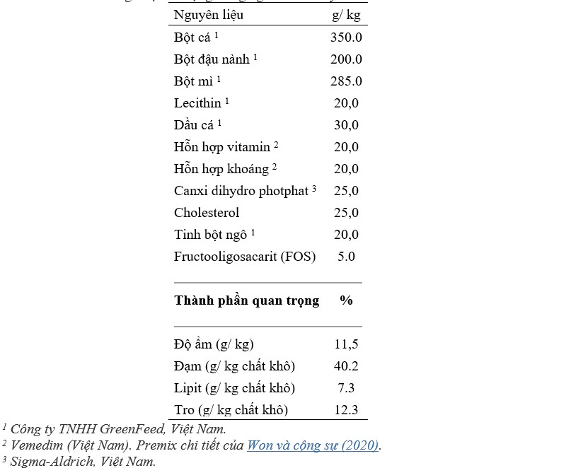 Tổng cộng, một khẩu phần ăn đối chứng và ba khẩu phần ăn thử nghiệm đã được xây dựng trong nghiên cứu này. Công thức thức ăn và thành phần gần đúng của khẩu phần ăn đối chứng được chuẩn bị có bổ sung 0,5% FOS trong khẩu phần ăn cơ bản được trình bày trong Bảng 1. Khẩu phần ăn đối chứng không được bổ sung P. pentosaceus (Đối chứng), trong khi ba khẩu phần ăn thử nghiệm khác được xây dựng công thức bằng cách bổ sung P. pentosaceus vào khẩu phần ăn đối chứng ở mức đưa vào là khẩu phần ăn 1 × 106 cfu/ g (P1), 1 × 107 cfu/ g khẩu phần (P2), hoặc 1 × 108 cfu/ g khẩu phần (P3). Việc chuẩn bị và bảo quản khẩu phần ăn được tiến hành theo Adel và cộng sự (2017). Tất cả các thành phần khô được cân, nghiền trong máy nghiền búa để đi qua sàng lưới 250 μm, sau đó được trộn trong máy trộn. Sau đó, dầu cá và nước được thêm vào cho đến khi tạo thành một khối bột nhão. Mỗi khẩu phần sau đó được đưa qua máy ép viên phòng thí nghiệm (3A, Việt Nam) để thu được các viên có đường kính từ 0,5 đến 1 mm. Các viên được sấy khô trong không khí trong 72 giờ đến độ ẩm <10%, sau đó được bảo quản ở 4°C trong tủ lạnh cho đến khi sử dụng. Các lô thức ăn mới được sản xuất 2 tuần một lần để duy trì khả năng sống sót của P. pentosaceus.