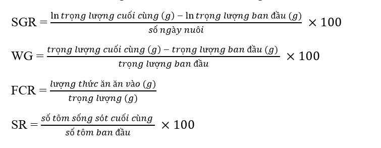Gia đoạn cuối của thí nghiệm, tôm được ngưng cho ăn trong 24 giờ, sau đó được cân và đếm. Dựa trên trọng lượng của từng con tôm và số lượng tôm con sống sót, tốc độ tăng trưởng cụ thể (SGR), tăng trọng (WG), hệ số chuyển đổi thức ăn (FCR) và tỷ lệ sống (SR) được tính toán theo công thức chuẩn (Adel và cộng sự, 2017):