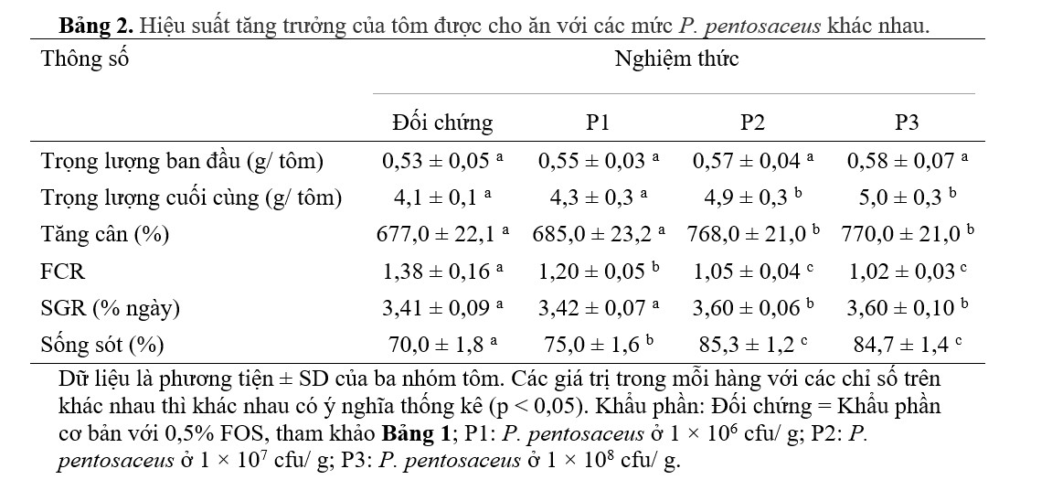 Hiệu suất tăng trưởng của L. vannamei đã được trình bày trong bảng 2. Trọng lượng cơ thể cuối cùng, WG và SGR của tôm đều tăng ở tất cả các nhóm được cho ăn bằng khẩu phần ăn có bổ sung P. pentosaceus so với nhóm được cho ăn bằng khẩu phần ăn đối chứng. Trọng lượng cơ thể cuối cùng và WG của tôm được cho ăn khẩu phần ăn P2 hoặc P3 cao hơn đáng kể (p <0,05) khi so sánh với nhóm đối chứng và nhóm P1. Các giá trị này của tôm trong nhóm được cho ăn bằng khẩu phần ăn P1 cao hơn nhưng không khác biệt đáng kể so với tôm trong nghiệm thức đối chứng (p > 0,05). FCR giảm và thấp hơn đáng kể ở tất cả các nghiệm thức được cho ăn bằng khẩu phần ăn có bổ sung P. pentosaceus so với ở nhóm đối chứng (p < 0,05). Tương tự như vậy, tỷ lệ sống sót cao hơn đáng kể trong tất cả các nhóm được cho ăn P. pentosaceus so với nhóm được cho ăn bằng khẩu phần ăn đối chứng. Tỷ lệ sống cao nhất được quan sát thấy ở nghiệm thức P2 khi tôm được cho ăn khẩu phần ăn có bổ sung P. pentosaceus ở mức bổ sung 1 × 107 cfu/ g, cao hơn đáng kể so với tỷ lệ quan sát thấy ở nghiệm thức P1 khi tôm được cho ăn P. pentosaceus ở 1 × 106 cfu/ g (p < 0,05) nhưng không khác biệt đáng kể so với tôm được nuôi bằng P. pentosaceus ở 1 × 108 cfu/ g (P3) (p > 0,05).