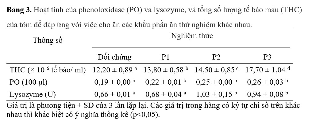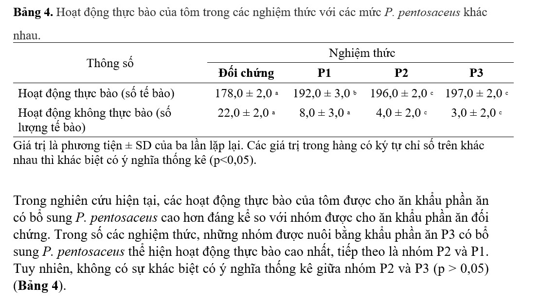 Trong nghiên cứu hiện tại, các hoạt động thực bào của tôm được cho ăn khẩu phần ăn có bổ sung P. pentosaceus cao hơn đáng kể so với nhóm được cho ăn khẩu phần ăn đối chứng. Trong số các nghiệm thức, những nhóm được nuôi bằng khẩu phần ăn P3 có bổ sung P. pentosaceus thể hiện hoạt động thực bào cao nhất, tiếp theo là nhóm P2 và P1. Tuy nhiên, không có sự khác biệt có ý nghĩa thống kê giữa nhóm P2 và P3 (p > 0,05) (Bảng 4).