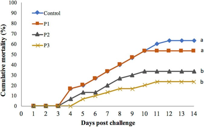 Tỷ lệ chết lần đầu tiên được quan sát thấy vào ngày thứ 3 sau cảm nhiễm ở tất cả các nhóm thử nghiệm ngoại trừ nhóm P3 được cho ăn bằng khẩu phần ăn có bổ sung 1 × 108 cfu/ g P. pentosaceus. Trong nhóm P3, tỷ lệ chết được ghi nhận vào ngày thứ 4 sau cảm nhiễm. Tỷ lệ chết thấp hơn có liên quan đến tỷ lệ chết khởi phát muộn hơn. Tỷ lệ chết tiếp tục cho đến ngày thứ 12 sau cảm nhiễm trong nhóm đối chứng. Trong khi ở các nghiệm thức, tỷ lệ chết chỉ tiếp tục cho đến ngày thứ 10, ngoại trừ nhóm P3, trong đó tỷ lệ chết tiếp tục cho đến ngày thứ 11 sau cảm nhiễm (Hình 1).