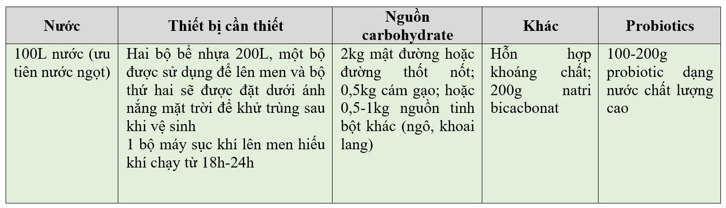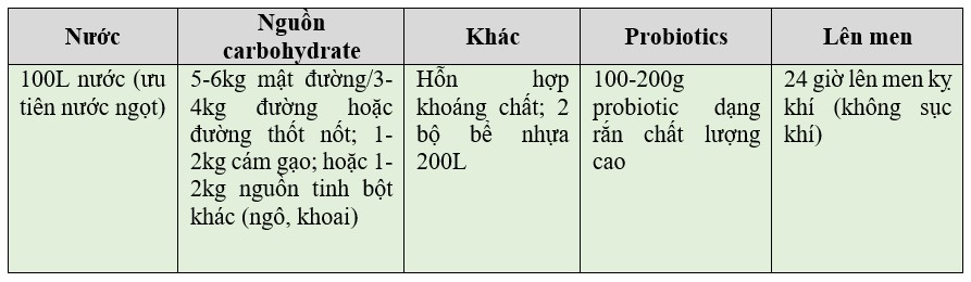 Lên men kỵ khí là quá trình trao đổi chất mà các chủng vi sinh vật có lợi lấy năng lượng từ carbohydrate trong trường hợp không có oxy để nhân lên và tạo ra các chất chuyển hóa có hoạt tính sinh học khác nhau. Danh sách các nguyên liệu cần thiết được trình bày trong Bảng 2. Liều lượng khuyến nghị là 100L/ha mỗi ngày và thời gian sử dụng vào lúc 2-3 giờ sáng là tốt nhất. Trong quá trình chuẩn bị ao, nên bổ sung ở mức 500L/ha để làm giàu dinh dưỡng nền đáy ao.