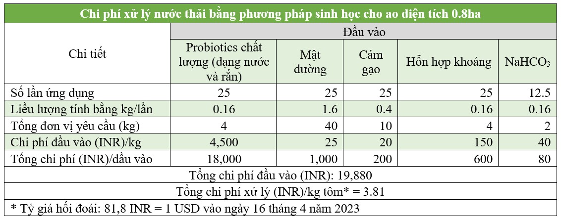 Bảng 3. Chi phí đầu vào cho việc xử lý chất thải bằng phương pháp sinh học trong nuôi tôm. Tổng chi phí là 3.81 INR/kg tôm