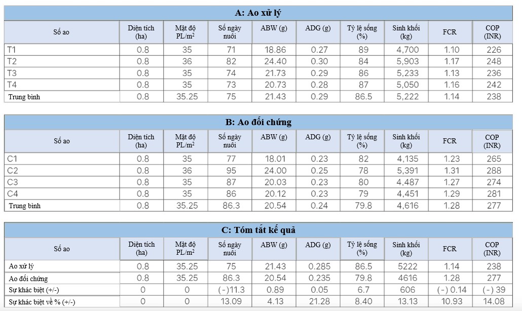 Ở các ao xử lý, hệ số chuyển đổi thức ăn trung bình (FCR) là 1,14 và chi phí sản xuất (COP) là 238 INR/kg (2,90 USD/kg), thấp hơn so với 1,28 và 277 INR/kg (3,38 USD/kg) trong ao đối chứng. Tỷ lệ sống trung bình trong ao xử lý cao hơn 8,4% so với ao đối chứng nhờ vào tình trạng sức khỏe tôm tốt trong suốt vụ nuôi (Bảng 4).