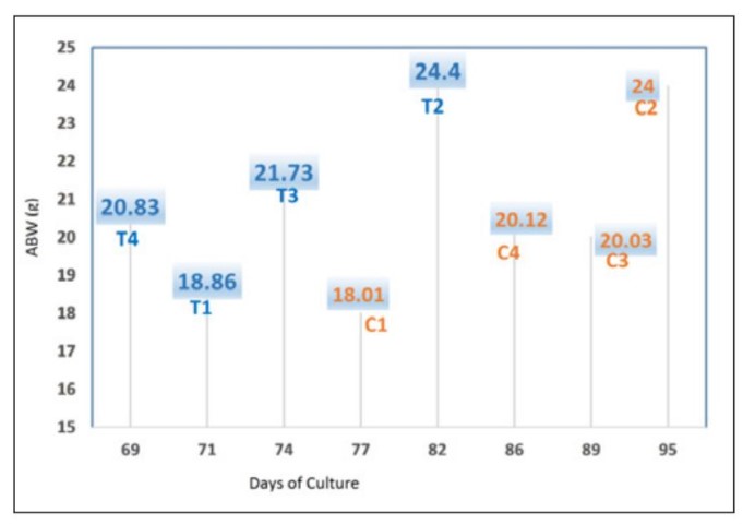 Hình 3. Hiệu suất tăng trưởng của tôm thẻ chân trắng theo trọng lượng cơ thể trung bình (ABW, tính bằng g) trong ao xử lý T1-T4 (màu xanh lam) và ao đối chứng C1-C4 (màu cam). Trong các ao xử lý, ABW là 21,43g ở ngày nuôi thứ 75 do tôm tăng trưởng tốt hơn so với ao đối chứng với ABW là 20,54g ở ngày nuôi thứ 86. Vì hầu hết nông dân thích thu hoạch tôm cỡ từ 20 đến 25g do giá tại trang trại tốt hơn và để nuôi được nhiều vụ hơn trên năm, tôm trong ao xử lý được thu hoạch sớm hơn