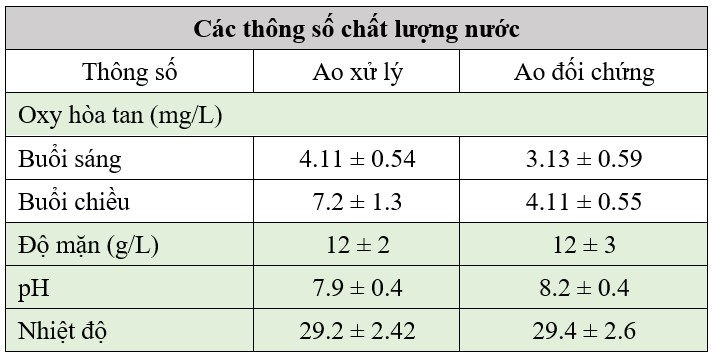 Ngoài ra, chúng tôi quan sát thấy rằng có sự biến động rất nhỏ đối với các thông số chất lượng nước (oxy hòa tan và pH) trong các ao xử lý. Điều này làm giảm mức độ căng thẳng cho tôm (Bảng 5).