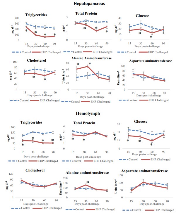 Hoạt động của enzyme tiêu hóa α- amylase trong HP của tôm được cảm nhiễm thấp hơn đáng kể (P <0,05) tại mọi khoảng thời gian so với tôm đối chứng. Tương tự, các hoạt động của enzyme lipase trong HP ở nhóm cảm nhiễm cũng thấp đáng kể (P <0,05) ở mọi khoảng thời gian (Hình 4). Mức triglyceride của tôm cảm nhiễm EHP ở cả HP và hemolymph trong mọi khoảng thời gian đều giảm đáng kể (P <0,05) so với nhóm đối chứng. Tổng số protein trong HP giảm đáng kể (P <0,05) ở ngày cảm nhiễm thứ 30, 60 và 90, trong khi ở hemolymph, tổng số protein thấp đáng kể (P <0,05) ở ngày cảm nhiễm thứ 15 và 30. Mức cholesterol trong HP của tôm ở nhóm cảm nhiễm giảm đáng kể (P <0,05) ở ngày thứ 30 và 60, không có sự thay đổi đáng kể ở các khoảng thời gian khác trong HP và hemolymph. Mức glucose của của nhóm cảm nhiễm EHP thấp đáng kể (P <0,05) ở ngày cảm nhiễm thứ 30 và 60 trong HP và ngày thứ 15, 30 và 60 trong hemolymph. Nồng độ alanine aminotransferase (ALT) tăng đáng kể (P <0,05) ở ngày cảm nhiễm thứ 15 và 30 trong HP, và ngày thứ 30 trong hemolymph, nhưng không đáng kể ở các khoảng thời gian khác. Đồng thời, aspartase transferase (AST) không có thay đổi đáng kể (P <0,05) trong cả HP và hemolymph ở bất kỳ khoảng thời gian nào (Hình 5).