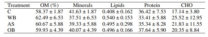 Liên quan đến thành phần sinh hóa gần giống bioflocs, không có sự khác biệt đáng kể về chất hữu cơ hoặc bất kỳ chất dinh dưỡng nào giữa các nghiệm thức (Bảng 3). Hàm lượng chất hữu cơ trung bình dao động từ 58,4% ở nghiệm thức đối chứng đến 62,5% ở nghiệm thức WB. Hàm lượng protein dao động từ 33,4% ở WB đến 37,6% ở OB. Nồng độ lipid thay đổi từ 0,4% ở đối chứng đến 0,5% ở WB. Hàm lượng CHO dao động từ 17,1% ở đối chứng đến 25,5% ở WB.