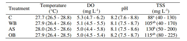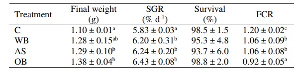 Bảng 1. Giá trị trung bình và (phạm vi) của các biến chất lượng nước cơ bản được ghi lại trong các nghiệm thức và đối chứng trong quá trình thử nghiệm. DO: oxy hòa tan, TSS: tổng chất rắn lơ lửng, C: đối chứng, WB: cám lúa mì, AS: hạt rau dền, OB: cám yến mạch. Chỉ số trên khác nhau trong một cột có nghĩa là sự khác biệt có ý nghĩa ở mức P < 0,05.