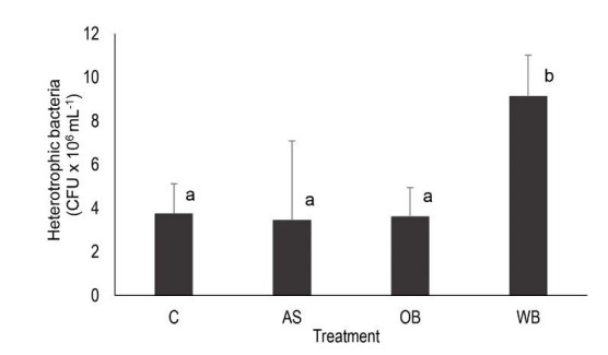 Hình 2. Sự phong phú của vi khuẩn dị dưỡng liên quan đến biofloc trong các nghiệm thức và đối chứng. C: đối chứng, AS: hạt rau dền, OB: cám yến mạch, WB: cám lúa mì. Chữ cái khác nhau trong các thanh biểu thị sự khác biệt đáng kể ở P <0, 05.