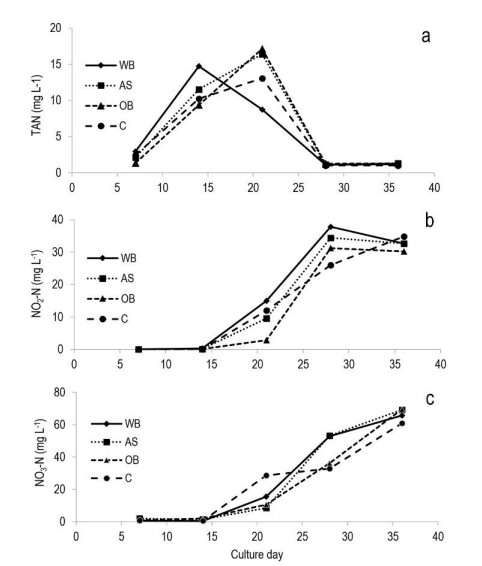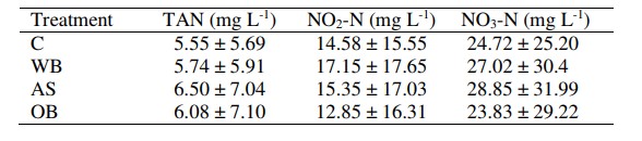 Trong tất cả các nghiệm thức, hàm lượng nitơ amoni tổng số (TAN) tăng lên từ đầu thí nghiệm, với mức trung bình tối đa (14-17 mg/L) giữa ngày 14 và 21, sau đó giảm xuống 1 mg/L vào ngày 28, được duy trì cho đến khi kết thúc thí nghiệm (Hình 1). Hàm lượng NO2-N tăng từ ngày 14 lên ngày 28, sau đó giảm nhẹ về cuối nghiên cứu. Nồng độ NO3-N tăng từ ngày 14 đến cuối nghiên cứu. Thử nghiệm ANOVA cho thấy không có sự khác biệt đáng kể giữa các phương pháp điều trị. Giá trị trung bình toàn cầu của TAN thay đổi từ 5,5 mg/ L (đối chứng) đến 6,5 mg/ L (nghiệm thức AS) (Bảng 2). Giá trị trung bình cao nhất của NO2-N (17,1 mg/L) được ghi nhận ở nghiệm thức WB và thấp nhất (12,8) ở nghiệm thức OB. Giá trị trung bình cao nhất của NO3-N được quan sát thấy ở nghiệm thức AS (28,8 mg/ L) và thấp nhất ở nghiệm thức OB (23,8 mg/ L).