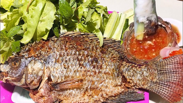Đây là một món ăn kinh điển, quen thuộc trên mọi mâm cơm. Cá rô phi được làm sạch, để nguyên vảy và chiên ngập dầu ở lửa vừa, có thể vắt thêm chút chanh vào dầu để giữ độ giòn và màu sắc đẹp mắt cho cá. Khi cá chín vàng đều, vớt ra để ráo dầu. Món này ăn kèm cùng gỏi xoài chua ngọt trộn rau răm và chén nước mắm chua ngọt đậm đà, tạo nên sự kết hợp hài hòa giữa vị béo của cá, vị chua thanh của xoài và hương thơm của rau răm.