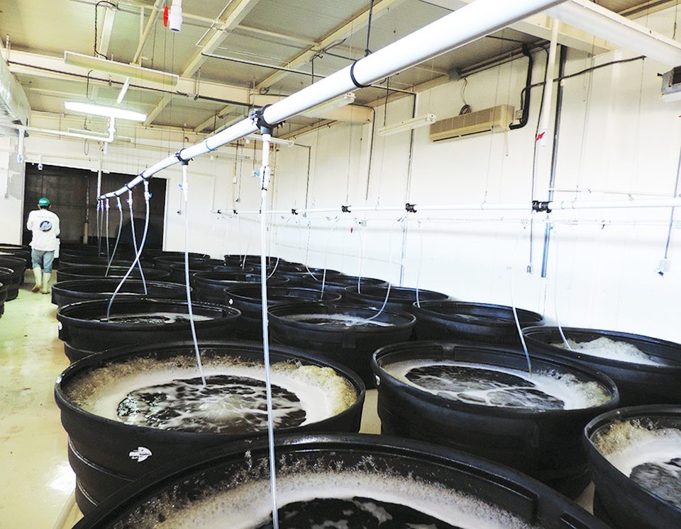 Khi tôm có trọng lượng 3 ± 1g được chuyển từ trong nhà sang các bể nhựa 1.000L chứa đầy nước biển 37 ppt đã được lọc, xử lý bằng tia cực tím và sục khí ở nhiệt độ từ 27 đến 30ºC. Thay nước một phần được thực hiện mỗi tuần một lần để loại bỏ thức ăn thừa và phân, cũng như để duy trì chất lượng nước.