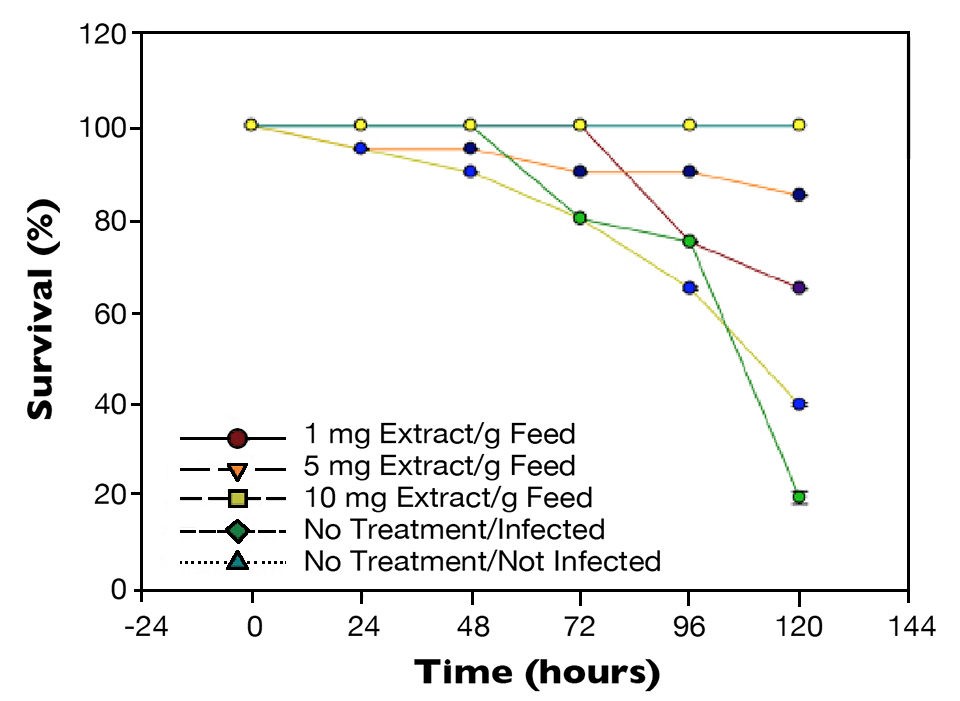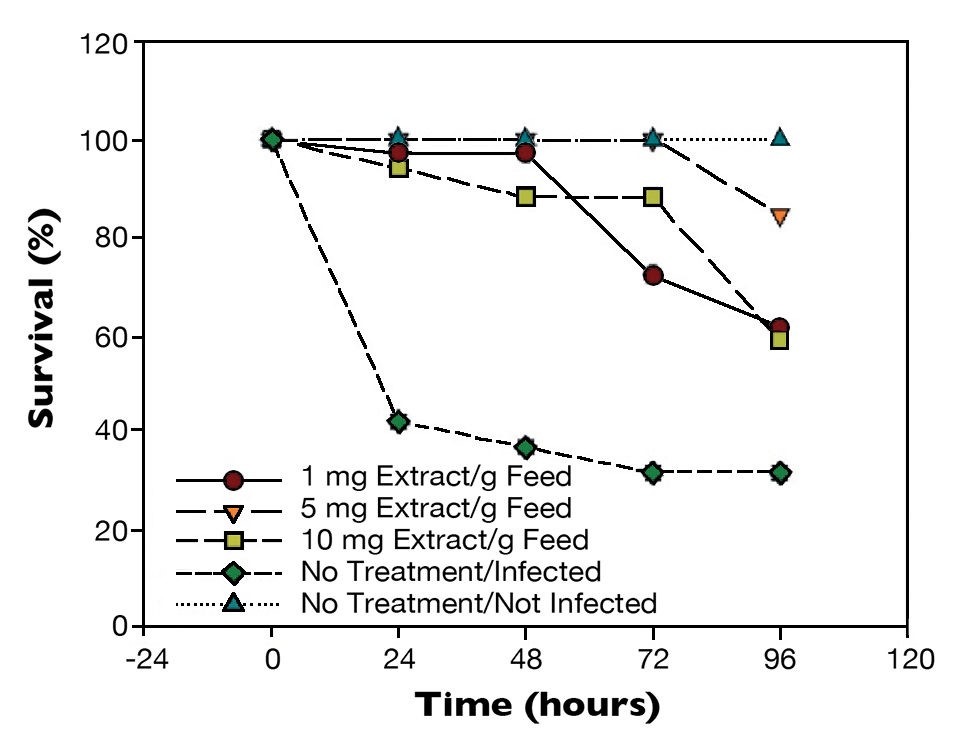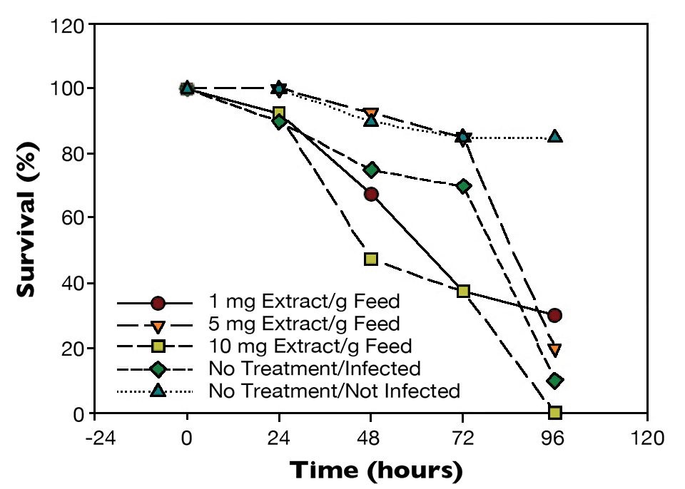 Kết quả sau 96 giờ sau khi cảm nhiễm cho thấy 30% tỷ lệ sống sót đối với đối chứng bị nhiễm bệnh. Tôm ăn khẩu phần ăn 1 hoặc 10 mg chiết xuất/g thức ăn có tỷ lệ sống 60% (P <0,05), trong khi tôm ăn khẩu phần ăn 5 mg/g có tỷ lệ sống 90% (P <0,01).