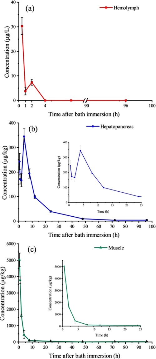 Để mô phỏng quá trình xử lý và vận chuyển, các nghiệm thức ngắn hạn và dài hạn được kết hợp trong bể ngâm liên tục. Giá trị nồng độ tối đa (Cmax, một phép đo tiêu chuẩn trong dược động học, là nồng độ tối đa trong huyết tương mà thuốc đạt được trong một bộ phận cụ thể sau khi dùng thuốc và trước khi dùng liều thứ hai) của eugenol lần lượt là là 50,0 μg/L, 413,1 μg/kg và 7623,0 μg/ g trong hemolymph, gan tụy và cơ. Điều này cho thấy rằng eugenol tích tụ trong hemolymph, gan tụy và cơ. So với nồng độ tối đa khi dùng một liều, các giá trị cao hơn có thể được quan sát thấy khi dùng nhiều liều đối với một số loại thuốc. Theo báo cáo của nhiều nghiên cứu khác, hầu hết các loại thuốc đều có xu hướng tích tụ trong hemolymph, gan tụy và cơ của tôm.