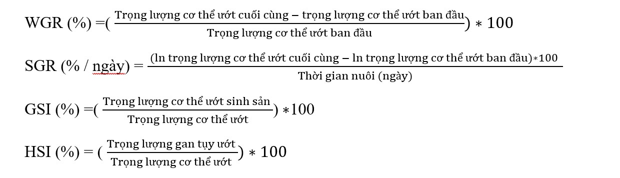 Vào cuối thí nghiệm, cua bị bỏ đói trong 24 giờ trước khi lấy mẫu. Cua trong mỗi nghiệm thức được gây mê trong 5 phút trên đá và cân để xác định tốc độ tăng trưởng (tỷ lệ tăng trọng, WGR; tốc độ tăng trưởng riêng, SGR; chỉ số sinh dục GSI; chỉ số gan, HSI). Cơ, gan tụy và buồng trứng của cua được mổ bằng dao mổ đã được làm sạch trước và kéo phẫu thuật. Trọng lượng cơ thể, gan tụy và buồng trứng được đo bằng cân kỹ thuật số chính xác đến 0,1 g. Sau đó, các mô đã mổ (buồng trứng, gan tụy và cơ) được bảo quản ở nhiệt độ −80℃ để phân tích thêm. WGR, SGR, GSI và HSI trong mỗi nghiệm thức được tính theo (Farhadi và Harlıoglu, 2019c).