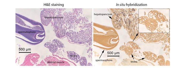 Hình 3. Các kết quả chụp ảnh vi mô của kiểm tra H&E và ISH ở một con tôm đực bị nhiễm EHP cho thấy tinh hoàn không dương tính với EHP theo kiểm tra ISH (tức là, tín hiệu ISH tối) ngay cả khi HP có biểu hiện nhiễm trùng nặng. Kết quả tương tự cũng thu được khi sử dụng tôm cái.