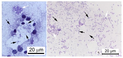 Hình 9. Hình ảnh chụp vết phết của tế bào HP và các sợi phân trắng từ tôm WFS cho thấy các bào tử EHP với các vi khuẩn hỗn hợp. (a) mô HP được phết cho thấy bào tử EHP (mũi tên trắng) cùng với vi khuẩn có hình thái hỗn hợp (mũi tên đen). (b) vết phết phân trắng từ ruột giữa cho thấy có bào tử EHP (mũi tên trắng) cùng với vi khuẩn có hình thái hỗn hợp (mũi tên đen).