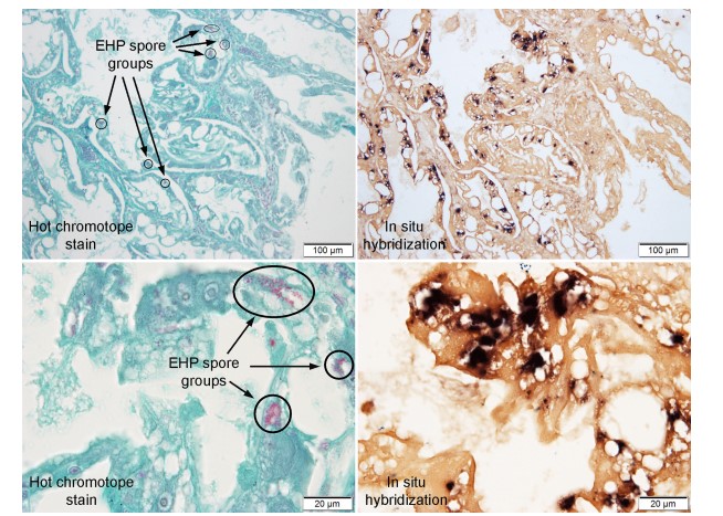 Do khó nhận biết các giai đoạn sống của EHP trong các phần mô H&E, một phương pháp nhuộm chromotrope đặc biệt đã được phát triển để phát hiện bào tử microsporidian (Moura và cộng sự, 1997; Weber và cộng sự, 1992) và nó hoạt động tốt với EHP và các bào tử nổi bật ngay cả với vật kính x40. Tuy nhiên, như thể hiện trong Hình 7, nơi các phần mô liền kề ở độ phóng đại thấp và cao được nhuộm màu bằng cách sử dụng phương pháp chromotrope (cột bên trái) và sử dụng phương pháp ISH (cột bên phải), phương pháp chromotrope có thể đánh giá mức độ của nhiễm trùng nghiêm trọng vì các tế bào HP bị nhiễm mà không có bào tử thì không được xác định.