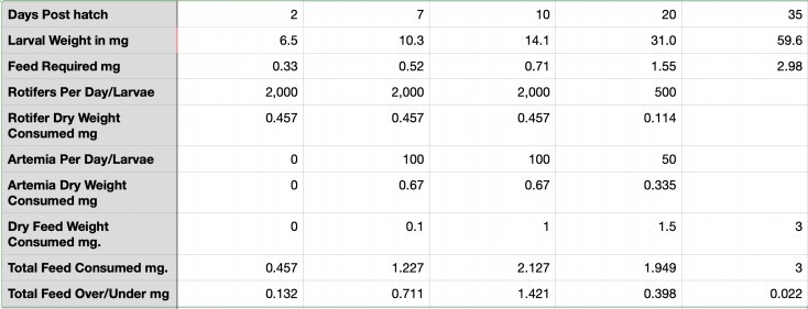 Trong vài ngày đầu tiên, 2000 luân trùng mỗi ngày là đủ để ấu trùng phát triển tốt. Nhưng đến ngày thứ 7, chúng tôi bổ sung Artemia cho luân trùng và bắt đầu cho chúng nếm thử thức ăn khô để giúp ấu trùng chấp nhận và chuyển sang thức ăn khô. Quá trình chuyển đổi sang thức ăn khô hoàn tất vào ngày thứ 21.