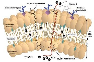 Dạng 3S, 3’S của astaxanthin nếu có sẵn về mặt sinh học sẽ cư trú trong tế bào và màng tế bào của ty thể. (Hình 7). Các nhóm este treo ở cả hai đầu của hợp chất trong môi trường ưa nước (tế bào chất và máu) trong khi hợp chất astaxanthin kỵ nước cư trú trong các cấu trúc lipid tạo thành màng plasma.