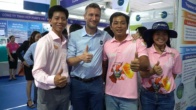 Ảnh: Nhân viên Bình Minh cùng khách hàng tại VietShrimp 2023